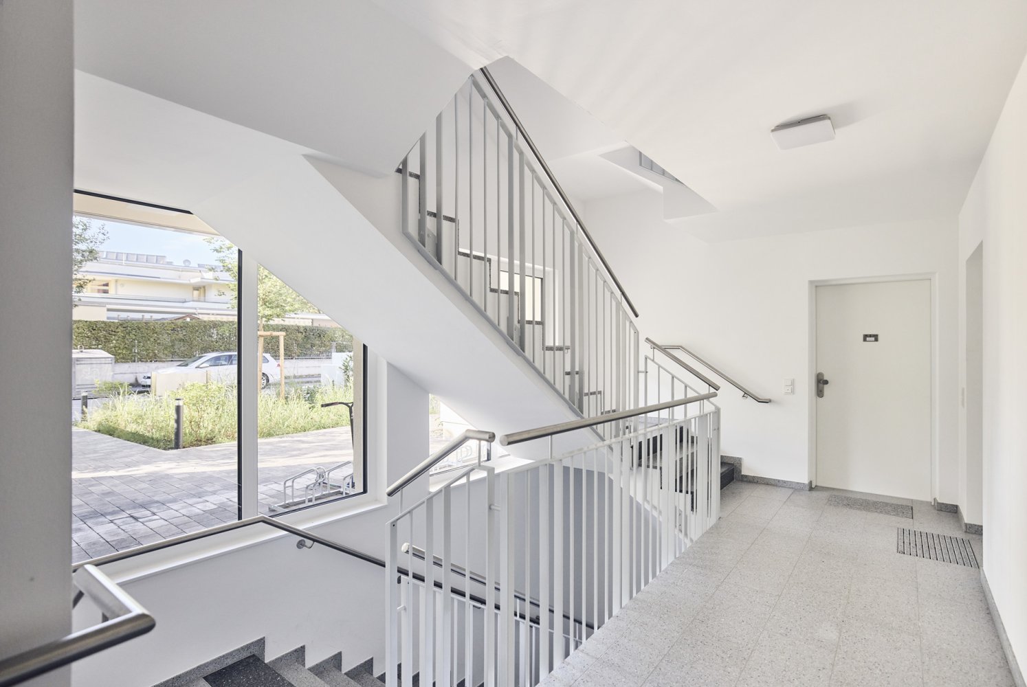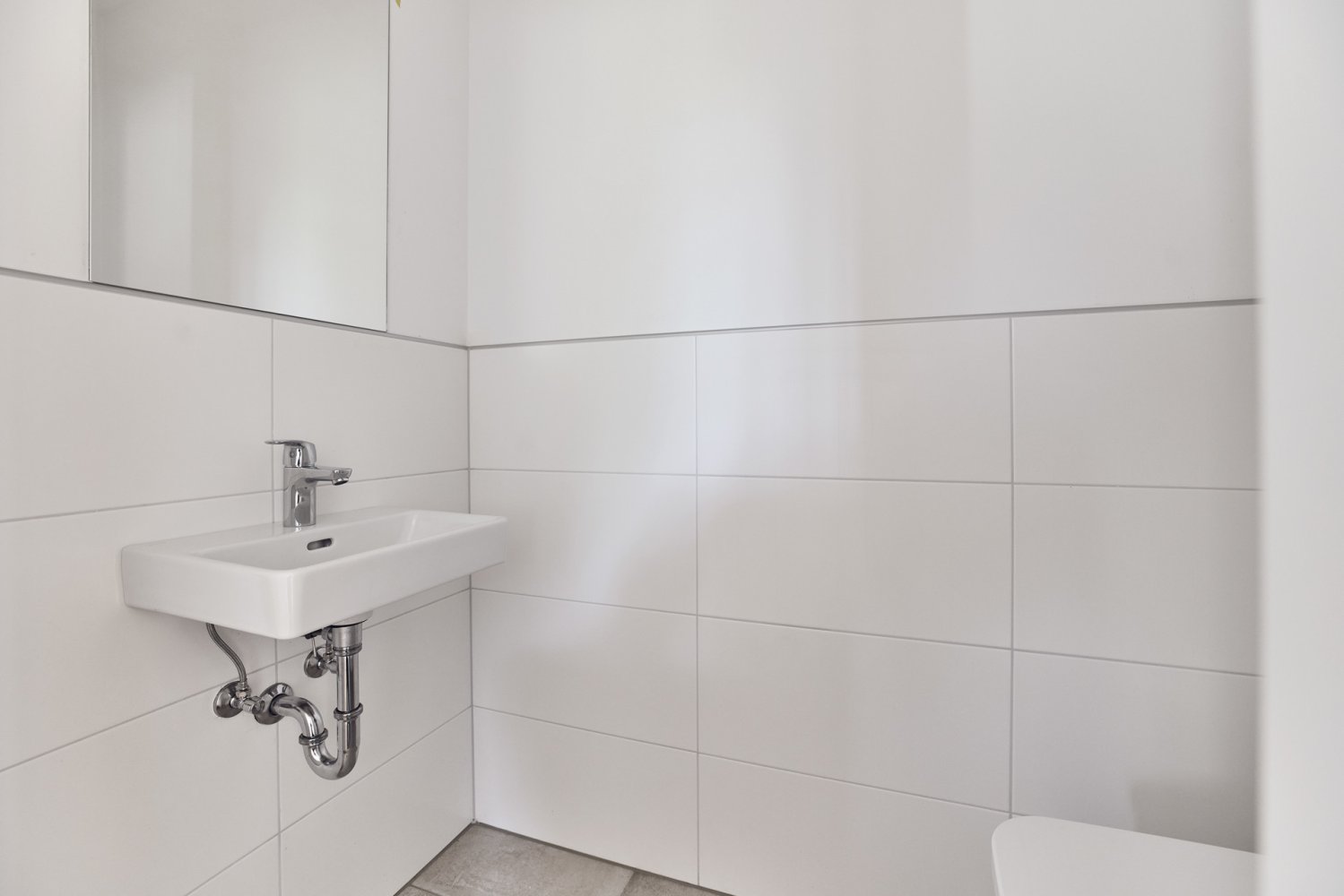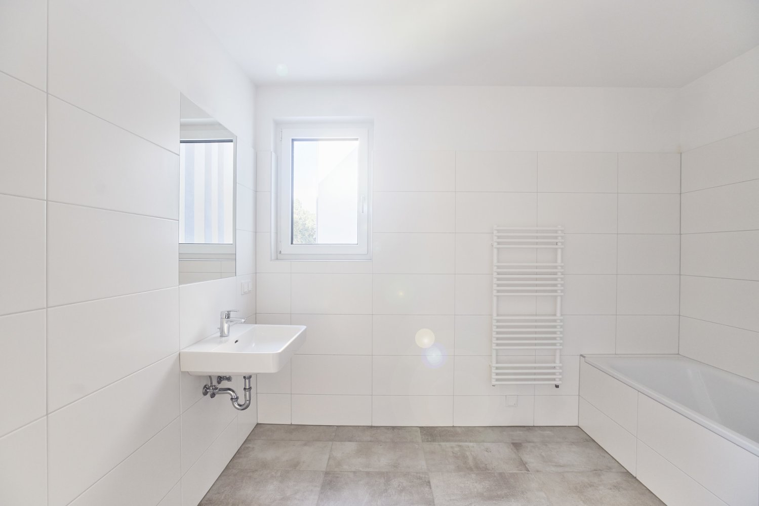 Das moderne Badezimmer überzeugt mit hellen, großformatigen Fliesen und zeitloser Ausstattung. Zusätzlich gibt es ein separates WC sowie einen praktischen Abstellraum.